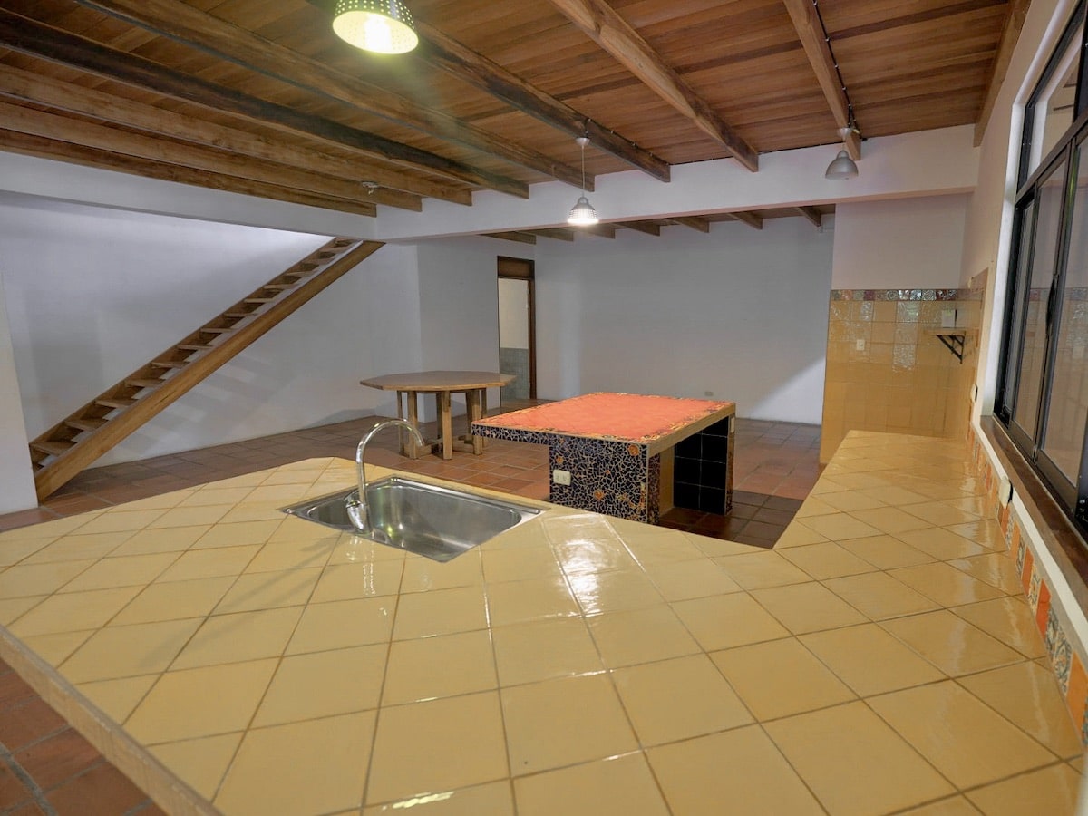 First Floor: 2 bedrooms / 1 1/2 baths – A spacious living area and kitchen with large countertops, large pantry and connected laundry room with an extra storage room. The high ceilings and skylights allow the natural light to pour into the main living space and maintain good air circulation. Classic tropical finishings with Terracotta tile throughout.